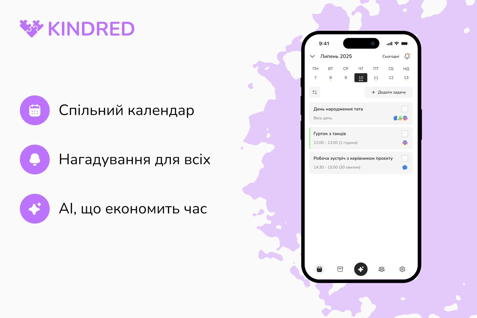 Єдиний простір для спільного календаря, завдань, чату й нагадувань. AI-асистент допомагає створювати події голосом і планувати час розумно. Kindred підходить для сімей і пар, які хочуть тримати порядок і залишатися близькими, навіть на відстані.